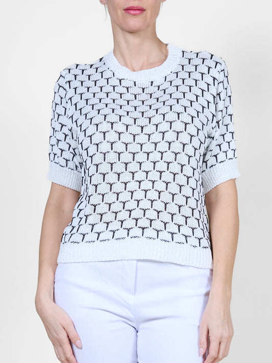 White and Black Short Sleeve Knit Sweater with Geometric Hexagon Design