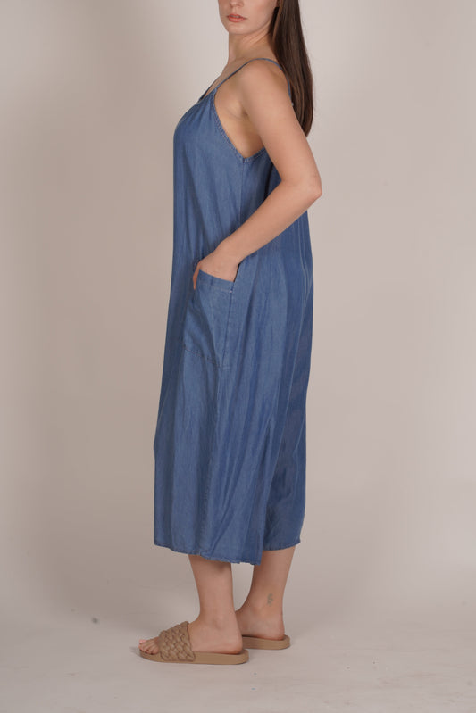 Dark Denim Sleeveless Wide-Leg Jumpsuit with Pockets