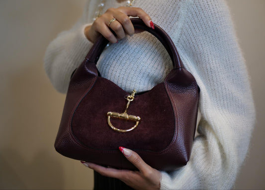 Burgundy Leather Suede Handbag with Gold Detail