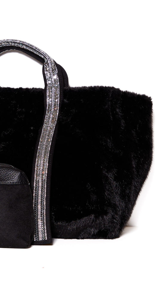 Black Oversized Faux Fur Tote Bag with Sequin Straps & Matching Pouch