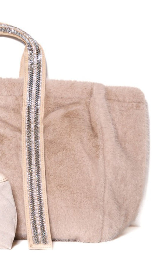 Beige Oversized Faux Fur Tote Bag with Sequin Straps & Matching Pouch
