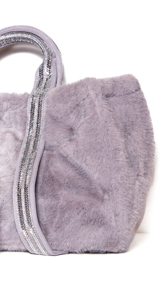 Grey Oversized Faux Fur Tote Bag with Sequin Straps & Matching Pouch