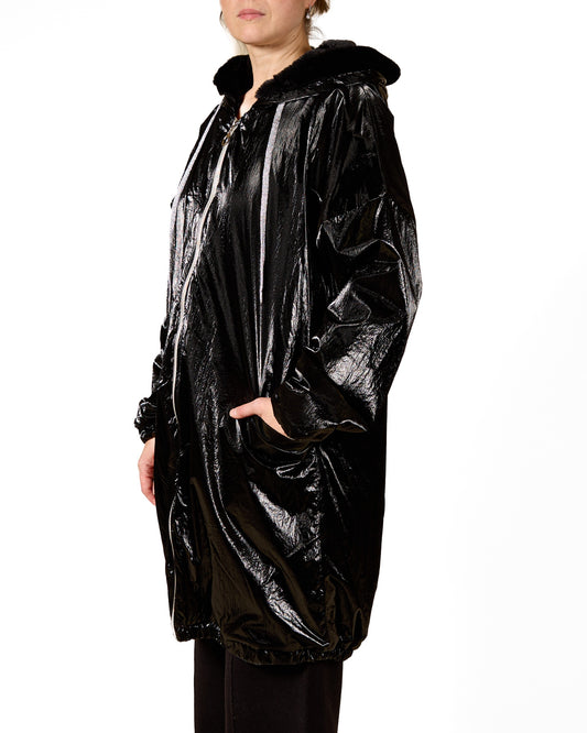 Black Zip Front Drawstring Hooded Int Plush Ext Lurex 2 Pkt Coat