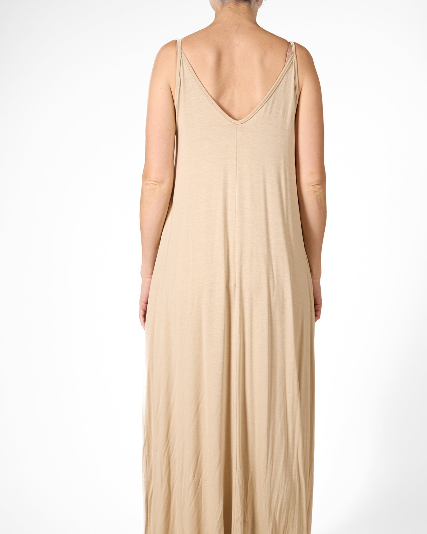 This maxi dress in tan features spaghetti straps and a flowing silhouette. The lightweight fabric ensures a breezy, comfortable fit.