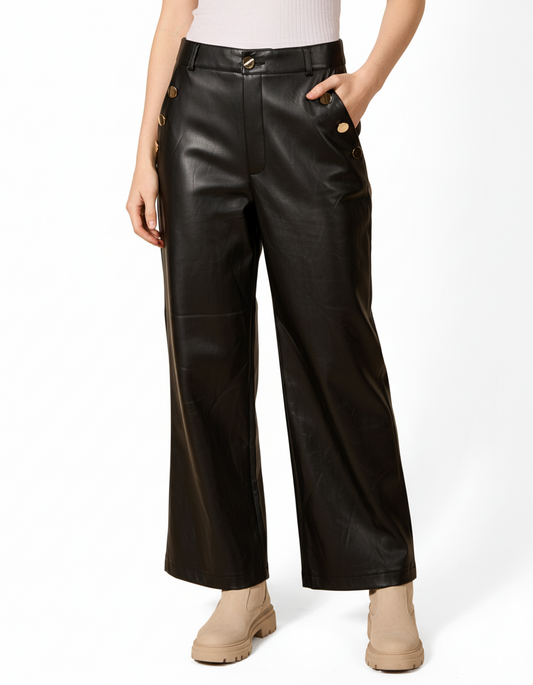 Ebony Button Front Napa Pleather Gold Button Detail Wide Leg Pant