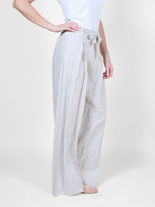 Oatmeal Melange Wide Leg Pants with Metallic Stripes and Tie Belt