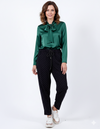 Black pull-on pants featuring a drawstring waist and allover rhinestone embellishments for standout style.